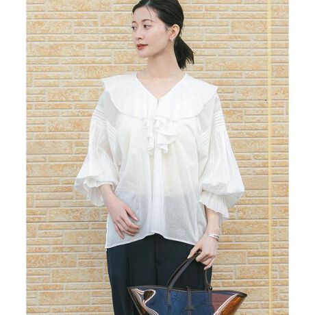 一枚で着映えする華やかなフリル衿が魅力の、コットンボイルラッフルブラウス。