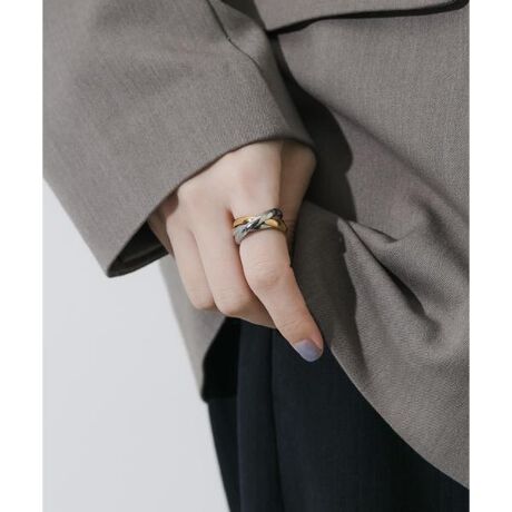 異なるカラーのリングを交差させた、存在感のあるデザインリングです。