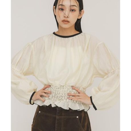 ウエストに施された、ポップコーンシャーリングデザインが存在感を放つトップス。自然とスタイルアップが叶い、襟や袖口、シャーリングカラーまで配色にしたところもポイント。程よく透け感のある素材は女性らしく、カジュアルボトムと好相性です。