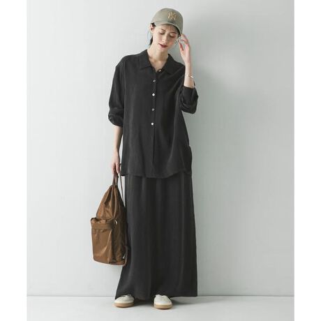 ツヤ感のある上品な素材なので、デニムやチノ素材といったカジュアルなボトムスを合わせたミックススタイルがおすすめです。また、同素材のスカートと合わせたセットアップなら、より洗練された装いが完成します。