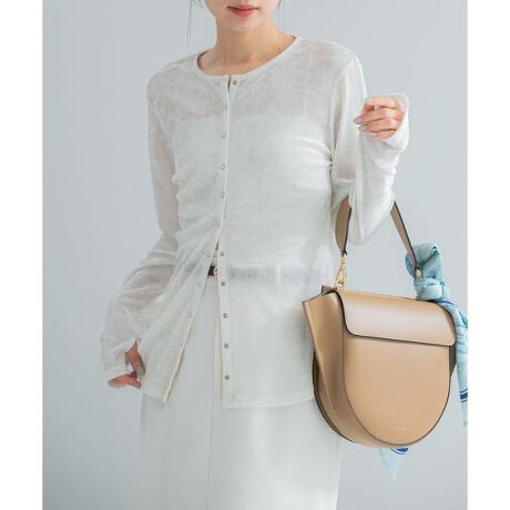 春の装いに馴染む程よいシアー感と、ベロア特有の柔らかな光沢が落ち着いた表情を演出するプルオーバーが登場。 カットソーの手軽さとブラウスの華やかさを兼ね備え、大人の日常をクラスアップしてくれる一枚です。フロントには華奢なリングドットをあしらい、さりげないアクセントをプラスしました。 上下のボタンを外すことで、その日の気分や合わせるボトムに合わせた抜け感の調整が可能。 長めに設計した袖丈や丸みのあるラウンドヘムが、洗練された今っぽさをさりげなく引き立てます。スラックスを合わせた知的な着こなしから、ボリュームのあるスカートスタイルまで幅広く活躍し、カジュアルになりすぎない表面感のためジャケットのインナーとしても重宝する万能なデザイン。 シンプルなボトムと合わせるだけで、素材のニュアンスが活きた奥行きのあるスタイリングが完成します。