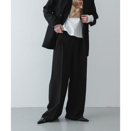 きれいめな表面感の素材を採用しているため、ブラウスと合わせたオフィススタイルから、カットソーを合わせたカジュアルな装いまで、幅広いシーンで重宝します。ウエスト部分はイージー仕様になっており、締め付け感のないストレスフリーな履き心地が魅力。体型をカバーしつつ脚長効果も期待できるワイドなシルエットが、立ち姿をスマートに見せてくれます。同素材のジャケットと合わせれば、より統一感のある洗練された着こなしが完成します。