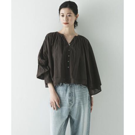 前後にたっぷりと施したギャザーと、インドならではの繊細なピンタックをあしらったボリュームスリーブがデザインのポイント。袖口をたくし上げてボリュームを強調した着こなしもおすすめです。フロントは前開き仕様になっており、軽い羽織りとしても重宝します。