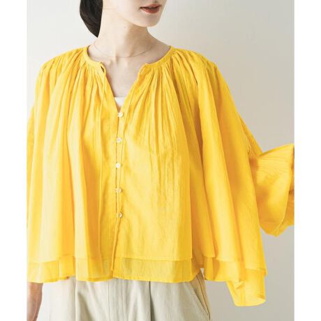 前後にたっぷりと施したギャザーと、インドならではの繊細なピンタックをあしらったボリュームスリーブがデザインのポイント。袖口をたくし上げてボリュームを強調した着こなしもおすすめです。フロントは前開き仕様になっており、軽い羽織りとしても重宝します。