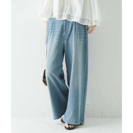 ヴィンテージライクな風合いの明るいブルーが季節感を引き立て、ルーズなシルエットとフロントのタックが、リラックス感のある着心地とさりげない体型カバーを両立。