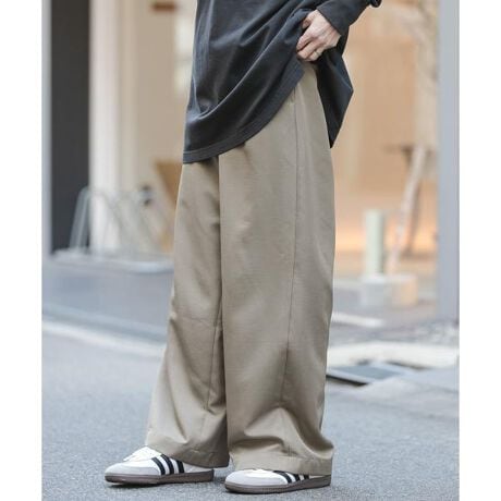 ウエストはオールゴムのドローストリング紐付きで楽に着られ、ワイドシルエットながらも落ち感のある風合いが魅力。