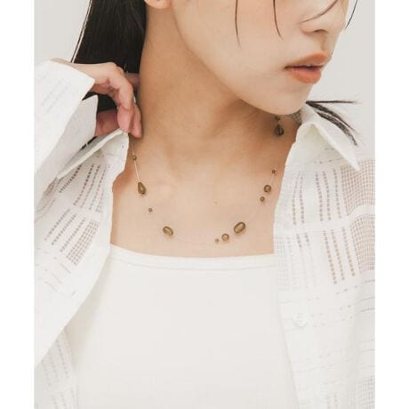 様々な形のアクリルパーツを使用した、しずくのイメージを演出したネックレス。紐も透明のものを使用しているので、全体的にクリアに仕上げました。お洋服のワンポイントにおすすめです。