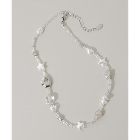 クリア、ホワイト、シルバーの異素材をランダムに連ねた、表情豊かなビーズネックレス。