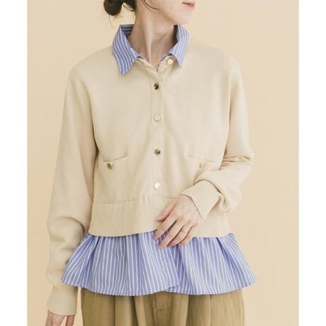 ニットとシャツを重ね着したように見える、フェイクレイヤード仕様のカーディガン。実際に重ねる必要がないため、着膨れせずすっきりとした印象に仕上がります。ニット部分はやや短めの丈感で、自然と腰位置を高く見せてくれるのもポイント。フロントのドットボタンが程よいアクセントとなり、きれいめな中にさりげない華やかさを添える一着です。