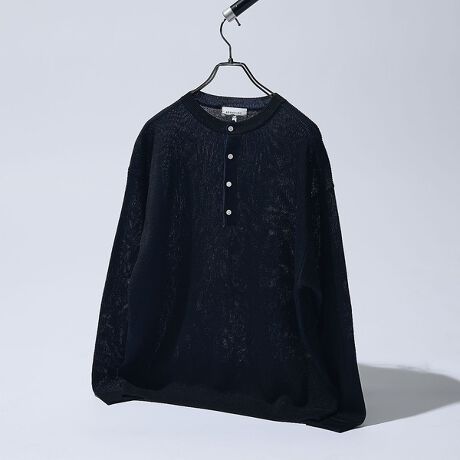 清涼感のある表情が引き立つヘンリーネックニット。