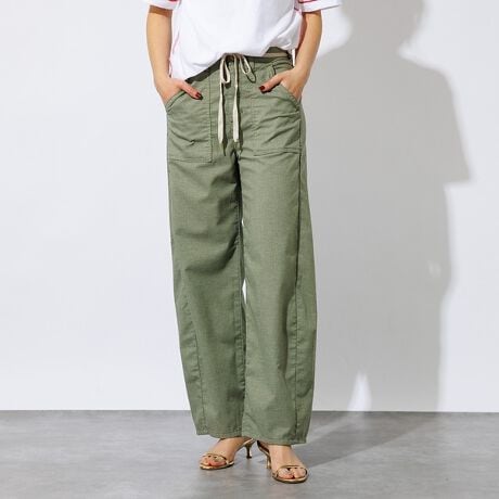 ワイドながらも裾に向かって絞られるたデザインで、すっきりとした印象に。腰部分にはゴムを使用し、優しく包み込むようなストレスフリーな穿き心地を実現しました。
