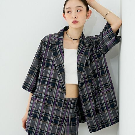 チェック柄が目を引く、コットン100の軽やかなハーフスリーブジャケット。
