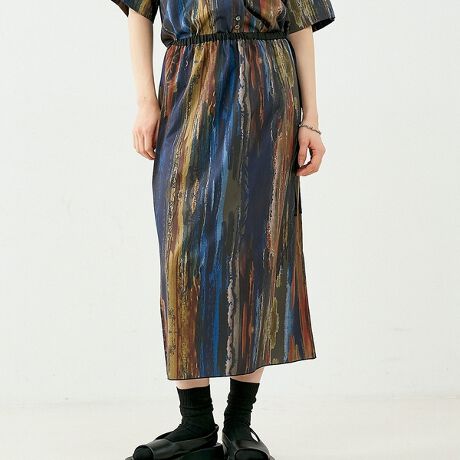 NOMINEオリジナルのペイントプリントを全面にあしらった、ストレートシルエットのスカート。
