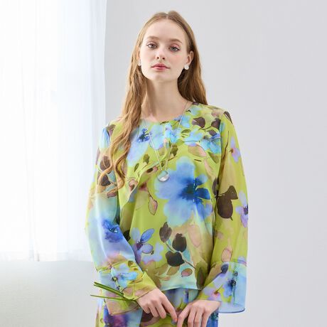 水彩タッチのぼかし花が上品で女性らしいプリント。華やかさがありながら凛とした美しさを感じさせてくれます。黒地ベースには赤い花、グリーンベースにはブルーの花を載せています。