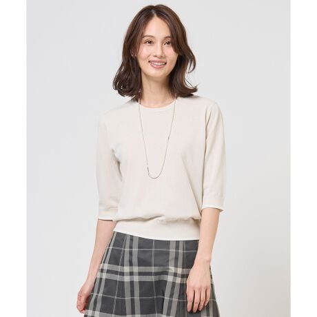 ■デザイン洗練された大人の着こなしを叶える、クルーネックニット。シンプルなデザインながらも、ひじ下までの袖丈と、全体の身幅のバランスにこだわり、二の腕をすっきりと見せつつ、上品な印象に仕上げました。1枚着としてはもちろん、同素材のカーディガンと合わせたアンサンブルでの着こなしもおすすめです。オフィスシーンから休日のカジュアルなお出かけまで、幅広いシーンで活躍する汎用性の高さも魅力です。カラーは、上品でやわらかな印象のライトベージュ(#002)、顔色を華やかに見せるローズピンク(#012)、爽やかで知的なアクア(#072)、シックで引き締まったネイビー(#075)の4色展開です。