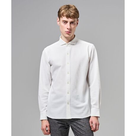 シンプルながら、独特の素材感で個性のあるシャツ。ノータイでもジャケットでも様になり幅広く対応します。