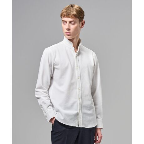シンプルながら、独特の素材感で個性のあるシャツ。ジャケットやニットなどVゾーンを彩る効果あり。