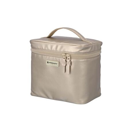 イタリア語で島を意味する“Isola”コレクション。地中海の島々にそそぐ、太陽の光をイメージしたシリーズです。こちらは、少し背が高めのメイクバニティーケース。フタの裏側にはブラシホルダーとブラシカバーが付いており、毛先を保護するとともに粉飛びの心配もありません。収納力が魅力の本体には、両サイドに4つのペンホルダーと5つのボトルホルダーを配置。取り外しが可能な2枚の仕切りには、ボトルホルダー/ゴムバンド、リップホルダー/透明ポケットと、異なるタイプの収納スペースが付いています。※写真はイメージです。実際はポーチのみの販売となります。<商品詳細>・素材:[表]PUレザー [裏]ナイロン・サイズ:W210×H195×D140mm・カラー:シャンパンゴールド(CGLD)・原産国:日本