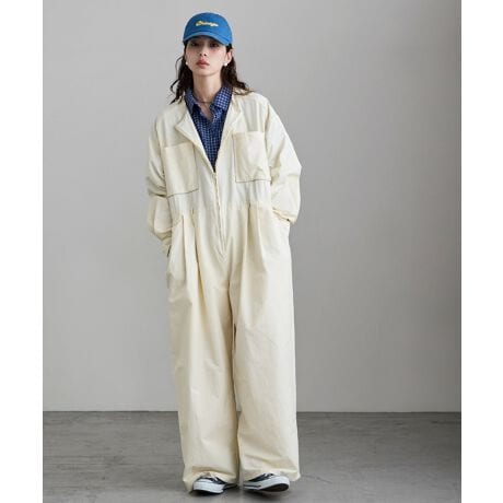 ジャンプスーツならではの太めのストレートシルエットに、ボトムのラインもルーズでかわいい。