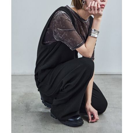 伸縮性のある針抜きテレコ素材で着心地抜群のオールインワン。