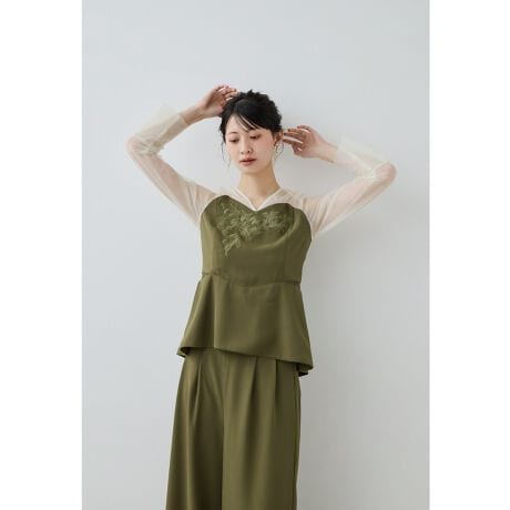 niana ニアナ 胸元の刺繍デザインがクラシカルなペプラムブラウスとワイドパンツの2ピースセット。