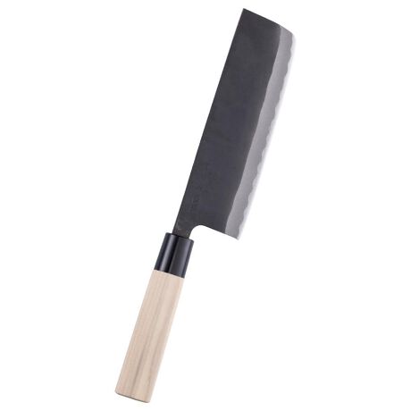 ●野菜を切るのに向いた包丁です(西型)。サビを防ぐ黒打ちタイプが多く、両刃でできています。