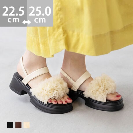 フリル部分と甲ストラップのライニング(内側の生地)にはスポンジ入りの素材を使用。足に負担をかけやすい厚底でも足にやさしい履き心地に。メッシュ素材なので足当たりも◎