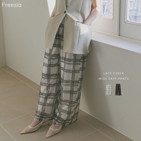 レース チェック ワイド イージー パンツ Freesia フリージア