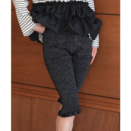 さりげなくきらめくグリッターニット素材に、裾のフリルがアクセントになった大人可愛いバイカーパンツ。
