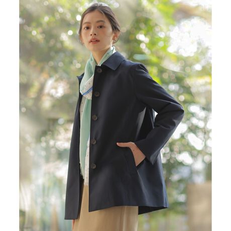 ■素材細番手のコンパクトコットンとポリエステルの糸を高密度に織り上げた素材。ヨコ糸にポリエステルを掛け合わせることで、重たさを軽減し、軽やかさと少しの光沢感を表現しています。着疲れしないソフトな風合いになるように柔軟加工と、春の小雨に対応できる撥水加工を施しています。