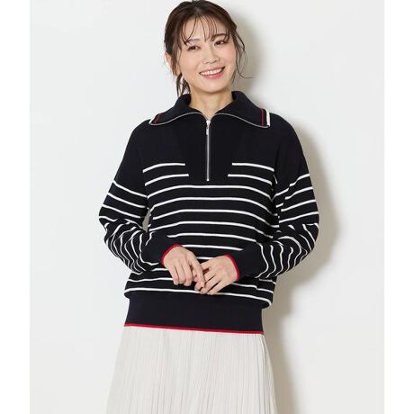 トレンド感のあるハーフジップが、大人のカジュアルスタイルを品よく更新するボーダーニット。凹凸のある編み地と配色ラインがアクセントになり、1枚で着映えするデザイン。ベーシックに着回しやすい、定番のホワイトとネイビーの2色展開。