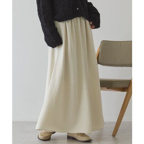 光沢のあるサテンで仕立てたマーメイドシルエットスカート。細めのウエストは総ゴム仕様で内紐により調節が可能です。ウエスト周りの分量を調整し、お腹まわりがすっきり見えるよう設計しました。両脇にスリットを入れて足さばきも良く、デイリーからきれいめスタイルまで幅広く活躍します。Tシャツやスウェットはもちろん、コクーンシルエットのトップスと合わせるのもおすすめ。