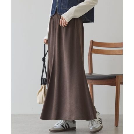 光沢のあるサテンで仕立てたマーメイドシルエットスカート。細めのウエストは総ゴム仕様で内紐により調節が可能です。ウエスト周りの分量を調整し、お腹まわりがすっきり見えるよう設計しました。両脇にスリットを入れて足さばきも良く、デイリーからきれいめスタイルまで幅広く活躍します。Tシャツやスウェットはもちろん、コクーンシルエットのトップスと合わせるのもおすすめ。