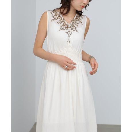 スカラップ刺繍が目を惹く、上品で大人かわいいノースリーブワンピース。