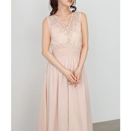 スカラップ刺繍が目を惹く、上品で大人かわいいノースリーブワンピース。