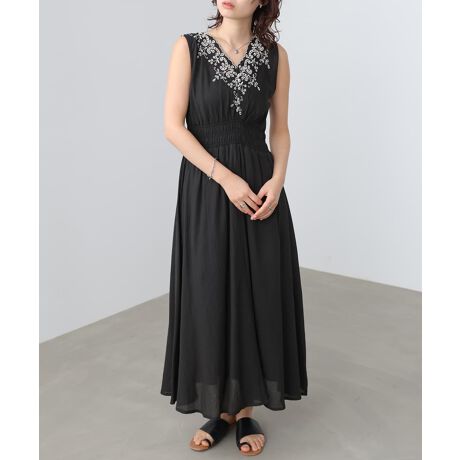 肩部分に施された繊細な刺しゅうデザインが華やかさをプラスし、1枚で着映えする主役アイテムです。ウエストのギャザーが自然とスタイルアップを叶え、ふんわり広がるシルエットで女性らしいニュアンスを演出してくれます。