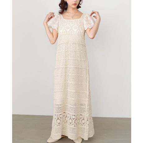 クロシェ編みのナチュラルな風合いに、異素材のスリーブをドッキングした特別感のあるワンピース。繊細な透け感とすっきりとしたIラインシルエットが、大人っぽく上品な印象に導いてくれます。袖がついているので二の腕が気になる方にもおすすめのアイテムです。