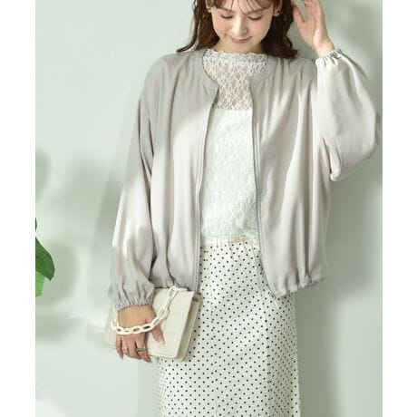 上品な光沢とドレープ感が魅力のダブルクロス素材。絶妙な表面感が美しく、カジュアルなアイテムの中に大人の余裕を感じさせてくれます。シワになりにくくさらりとした風合いも嬉しいポイントです。裏地がないことでシャツ感覚で羽織れる軽さも◎さらりと肩の力を抜いて着られるブルゾンです。ノーカラーでスッキリしたデザインに裾と袖口にゴムを使用し、シンプルな中にも女性らしさが漂う1枚。