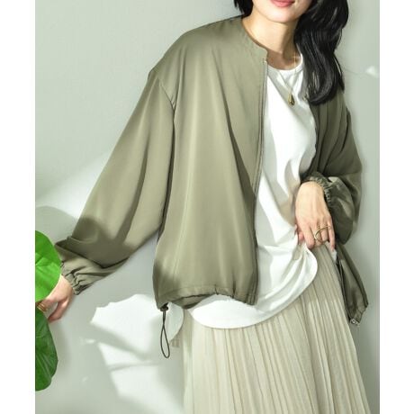 上品な光沢とドレープ感が魅力のダブルクロス素材。絶妙な表面感が美しく、カジュアルなアイテムの中に大人の余裕を感じさせてくれます。シワになりにくくさらりとした風合いも嬉しいポイントです。裏地がないことでシャツ感覚で羽織れる軽さも◎さらりと肩の力を抜いて着られるブルゾンです。ノーカラーでスッキリしたデザインに裾と袖口にゴムを使用し、シンプルな中にも女性らしさが漂う1枚。