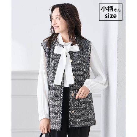 フェミニン派もハンサム派にもおすすめのツイードジレ。