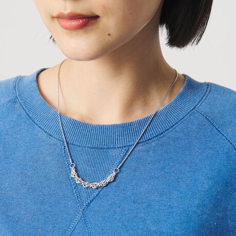 透け感のあるニットやシャツのネックラインにモダンなアクセントとして好バランス。