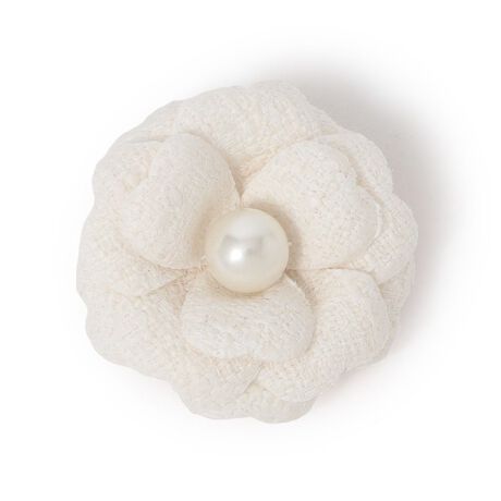 ファンシーツイードのカメリアコサージュ。国内生産でひとつひとつ丁寧に製作していただきました。ホワイト(01)は上品なホワイトのツイード、ブルー(22)はブルーのミックスで新鮮、ネイビー(29)はベースのネイビーにほどよいシルバーラメ入りのコサージュです。直径約6cmでコーディネートに取り入れやすいサイズです。