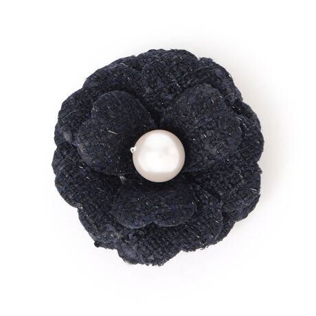 ファンシーツイードのカメリアコサージュ。国内生産でひとつひとつ丁寧に製作していただきました。ホワイト(01)は上品なホワイトのツイード、ブルー(22)はブルーのミックスで新鮮、ネイビー(29)はベースのネイビーにほどよいシルバーラメ入りのコサージュです。直径約6cmでコーディネートに取り入れやすいサイズです。