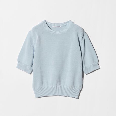 コイル形状の糸を使用した、端正な編地がポイントのショートスリーブニット。