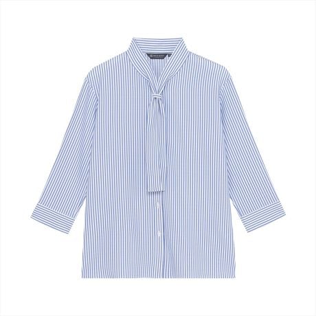 はっきりとしたブルーストライプ生地にボウタイの組み合わせは華やかな衿回りを演出します。