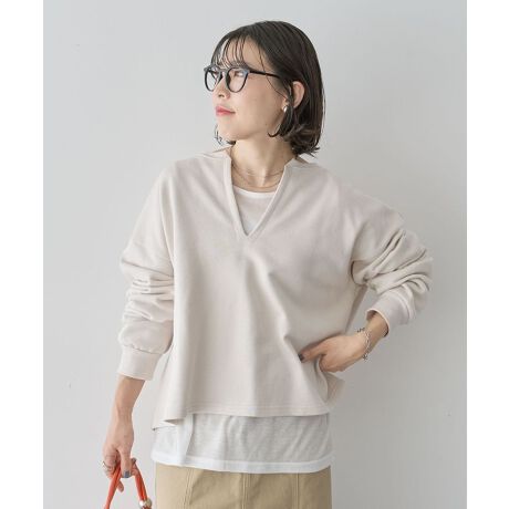 重ねるだけで完成する、抜け感レイヤードトップス深めに入ったVネックが印象的なプルオーバーと、インナーのセットです。計算されたレイヤードデザインなので、重ねるだけで自然と奥行きのある着こなしが完成します。裏毛素材を使用しており、程よい厚みとやわらかな肌触りで、リラックス感のある着心地です。短すぎない丈感とゆとりのあるシルエットが体のラインを拾いにくく、さりげなく体型カバーも叶えます。単体でも使えるデザインのため、手持ちのトップスと組み合わせて着回しが楽しめるのも魅力です。デニムやワイドパンツ、スカートとも相性が良く、デイリーからお出かけまで幅広く活躍します。レイヤードスタイルを簡単に楽しみたい方におすすめの一着です。