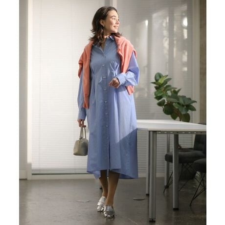 きちんと感と抜け感を両立する、大人の毎日ワンピースやわらかなストライプ柄が上品な印象を与え、さっと着るだけでコーディネートが完成します。抜け衿デザインが顔まわりをすっきり見せ、ほどよいリラックス感を演出します。ウエスト部分に施したタックが自然な立体感を生み、体のラインを拾いにくく、スタイルアップ効果も期待できます。縦のラインを強調するシルエットで、すらりとした印象に導いてくれます。イージーケア素材を使用しているため、お手入れが簡単で忙しい日常にも寄り添います。羽織りとしても着用でき、気温差のある日にも活躍します。デイリーからお出かけまで幅広く使え、色違いで揃えたくなる一枚です。透け感[ややあり]