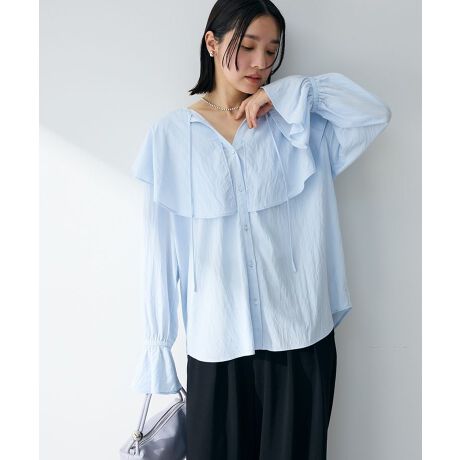 上品な甘さを纏う、華やぎブラウス。大きめのラッフルが印象的で、シンプルな装いに取り入れるだけで華やかさを演出できるデザインです。程よいボリューム感が体のラインを拾いにくく、自然にスタイルを整えてくれます。軽やかな素材感で動きやすく、ふんわりとした袖口が手元まで優しい雰囲気に仕上げます。前を閉じてきちんと感を出したり、少し開けて抜け感を楽しんだりと、着こなしの幅が広いのもポイントです。パンツにもスカートにも合わせやすく、オンオフ問わず活躍します。コーディネートの主役として使えるため、シーズンを通して頼れる存在です。毎日の装いに上品な可愛らしさを添えてくれます。透け感[ややあり]