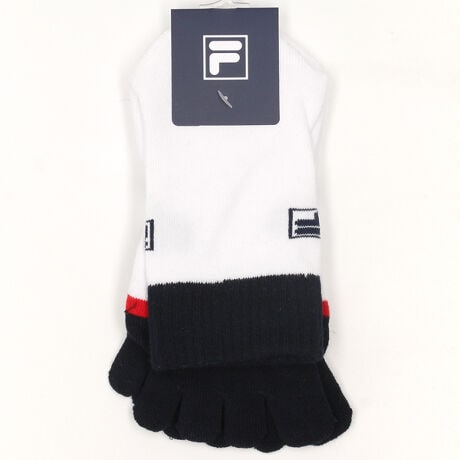 [型番:785932]蒸れ防止効果大の5本指ショートソックス。FILAらしい切替配色のデザインがポイント。持続消臭機能があり、底面には滑り止めプリントを施しております。