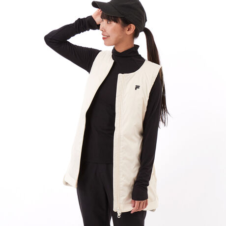 [型番:794211F]ポケット付きで便利に使えるダウンベスト。フロントはファスナー仕様で着脱も簡単です。胸元に配したFILAロゴがアクセントとなり、ゴルフやカジュアルコーディネートで活躍します。